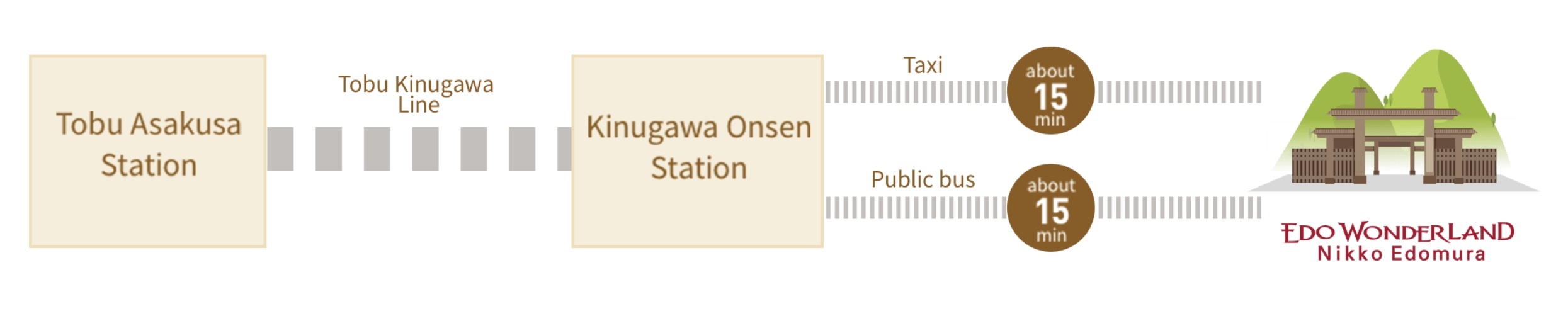 Easy Access from Tokyo Edo Wonderland Nikko Edomura is easily accessible from Tokyo. Take the Tobu Railway Limited Express from Asakusa to Tobu-Nikko—the journey takes about 2 hours.